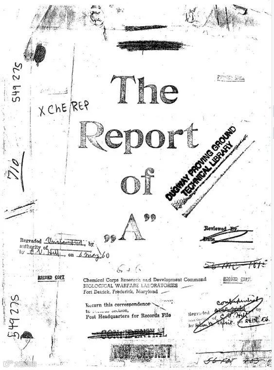 这张照片是《死亡工厂》作者谢尔顿·哈里斯在美国陆军杜格威试验场图书馆发现的731部队三份人体解剖实验报告(英文翻译本)之一的封面。它们由731部队成员提供给美国人,用以换取对他们免于战争罪的起诉。“A”是指炭疽菌(Anthrax)。这份报告最初保存在美国德特里克堡。“A”下面的三行小字明确写着 “化学部队研究开发总部,生物武器实验室,德特里克堡,弗雷德里克,马里兰”。
