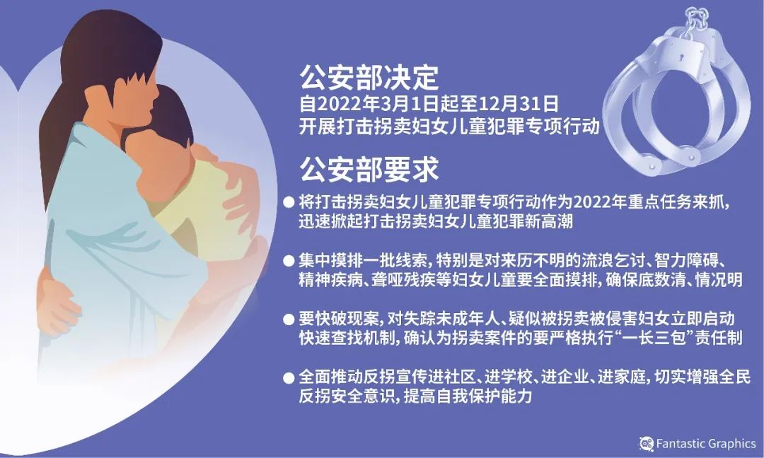 据新华社报道,公安部决定,自3月1日起至12月31日开展打击拐卖妇女儿童犯罪专项行动。全国公安机关打击拐卖妇女儿童犯罪专项行动动员部署电视电话会议3月2日召开,部署全国公安机关迅速组织开展打击拐卖妇女儿童犯罪专项行动,切实维护妇女儿童合法权益。公安部要求,要集中摸排一批线索,特别是对来历不明的流浪乞讨(vagrants and beggar)、智力障碍、精神疾病(mentally challenged)、聋哑残疾(verbal and hearing disabilities)等妇女儿童要全面摸排,确保底数清、情况明。