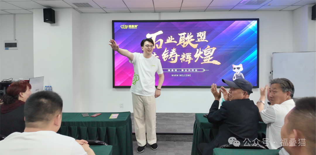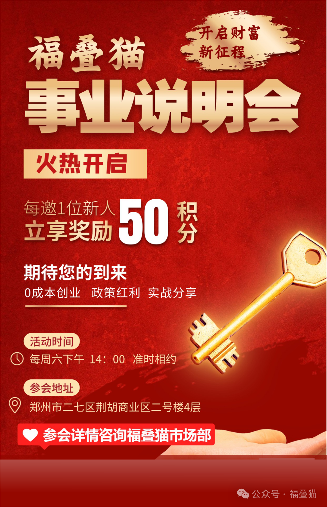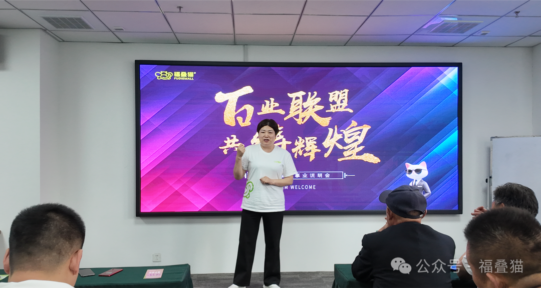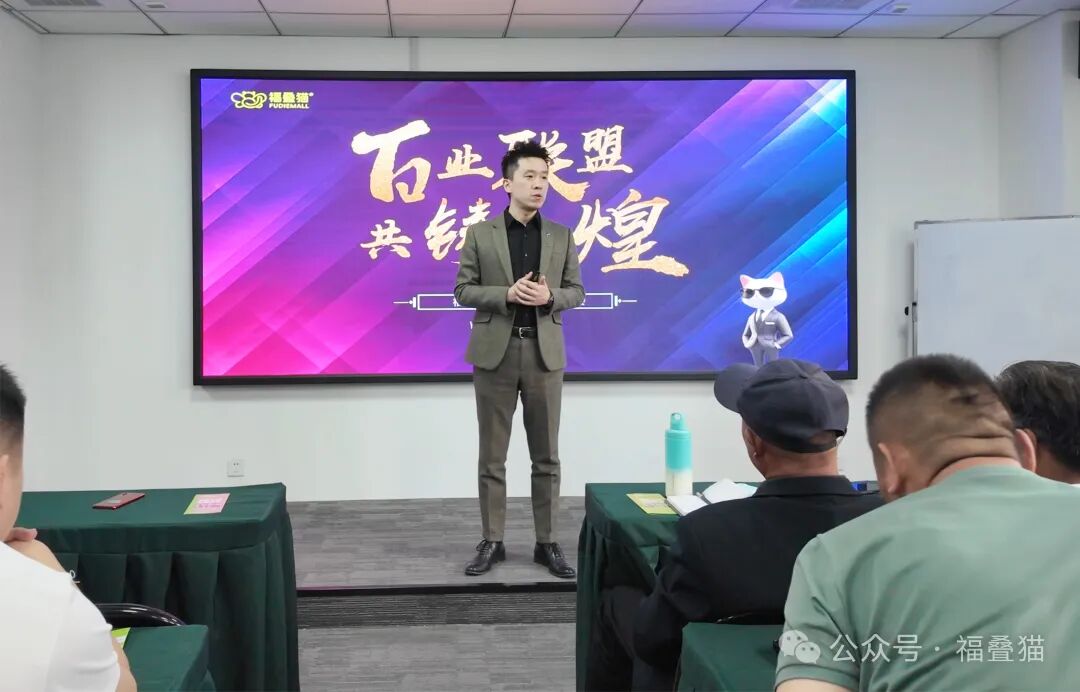 2025年4月19日,福叠猫事业说明会璀璨启航。本次会议以"百业联盟·共铸辉煌"为主题,吸引了来自全国各地的50余位行业精英、意向合作家人齐聚福叠猫郑州总部,共同见证福叠猫平台的无限商业前景!