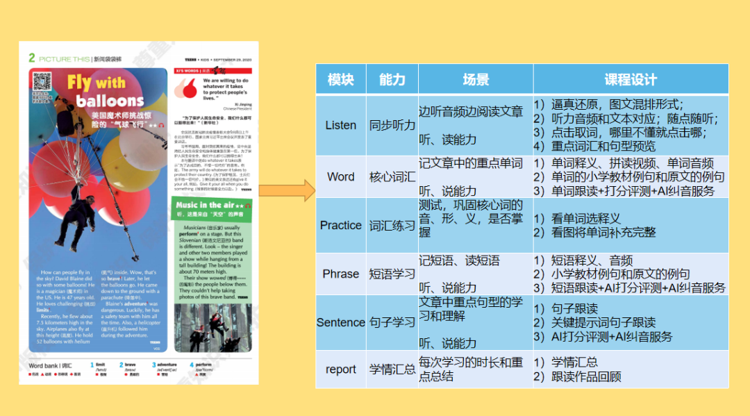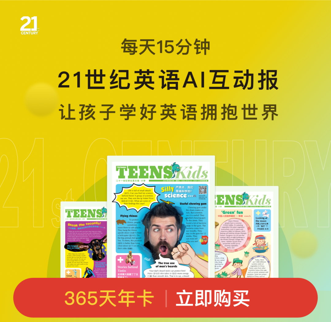 “21世纪英语AI互动报”是以《21世纪报》的文章为阅读素材,增加了AI互动的学习功能,比如单词、句型、文章的听说、跟读和纠音,以此提升孩子英语综合能力的阅读性产品。