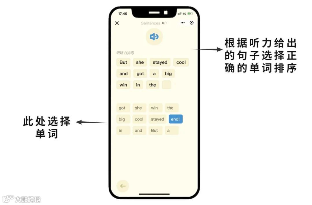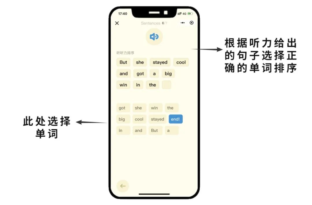 跟读完句型,即可进行句型的课后练习。根据听力给出的句子给单词排序,锻炼听力的同时也可以检测孩子的单词拼写。