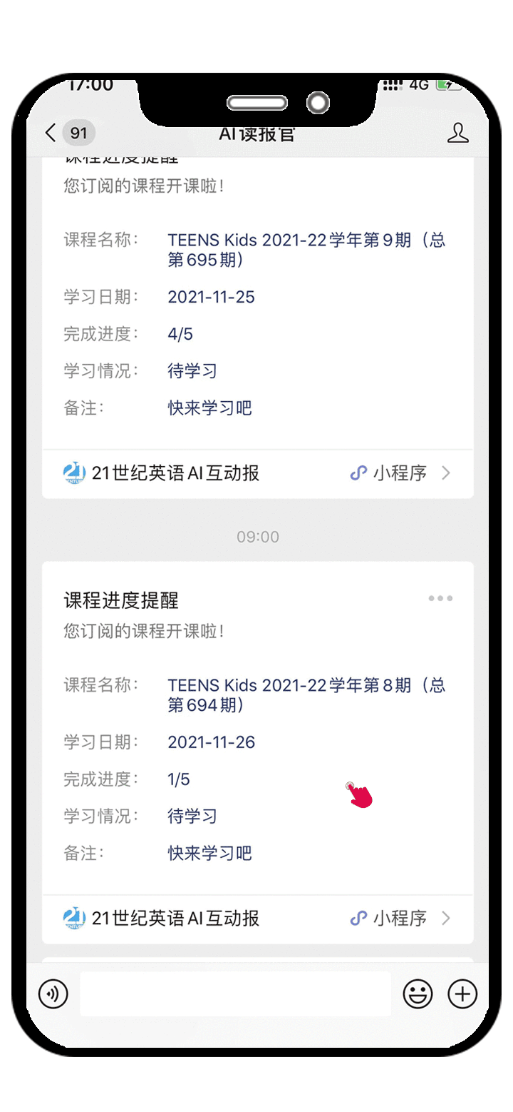 每日督学提醒,会通过微信推送,提示当日阅读内容,帮助孩子养成每日阅读15分钟的良好习惯。