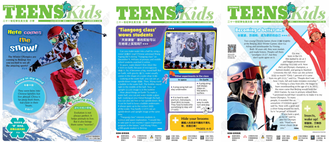 作为China Daily旗下的报刊,《二十一世纪学生英文报·小学版》选题紧跟国内外热点事件,通过生动易懂的语言、图文并茂的形式,集时政新闻、人文故事、科学常识于一身,在趣味阅读的基础之上,为孩子打开一扇认知世界之窗。