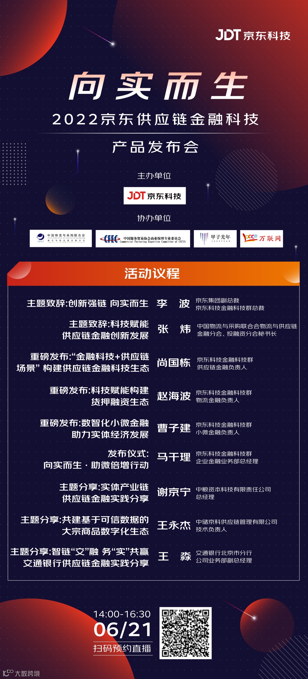 6月21日14:00,京东科技将举办“向实而生·2022京东供应链金融科技产品发布会”,重磅发布供应链金融科技三大解决方案,同时邀请业内嘉宾共议供应链金融科技如何助力实体经济发展。看点多多,点击下方预约提前锁定。