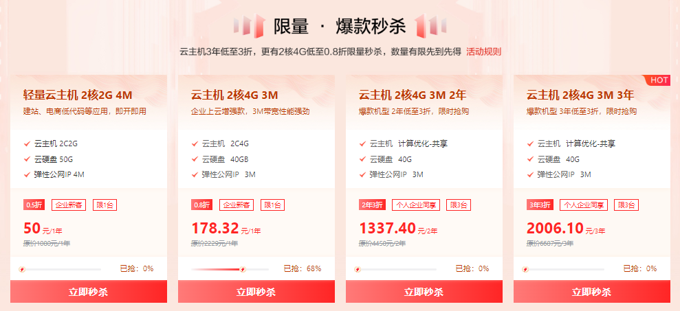 节日期间,新客秒杀不停。轻量云主机“2核2G 4M”低至50元一年,云主机爆款机型“2核4G 3M”低至0.8折,1年仅需178.32元,2-3年3折特惠限时秒杀,考验大家手速的时候到了!
