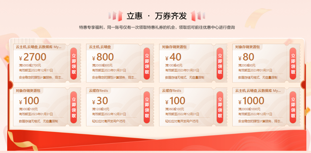 先领券,再下单,享特惠——11.11活动万券齐发,新老用户都可领取特惠大礼包。云主机、云硬盘满5000减2700,满2000减1000,对象存储资源包满100减40,云缓存Redis满120减30。