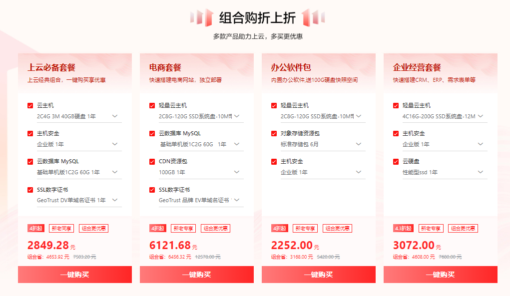 11.11新增重磅玩法——新老客户产品组合购开启折上折优惠,上云必备套餐、电商套餐、办公软件包、企业经营套餐4折起,爆款产品组合购买,可获得更多优惠福利,一次拼个够!