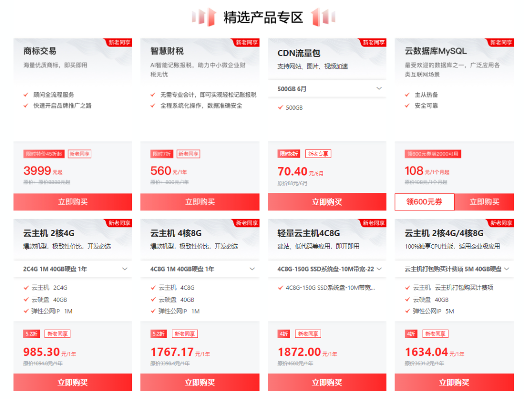 初创企业不容错过的11.11精选多款热卖爆品——商标交易限时特价4.5折起,智慧财税限时7折,CDN流量包6个月仅需70.4元,云数据库MySQL低至108元/月,还可叠加满2000减600大额优惠券。