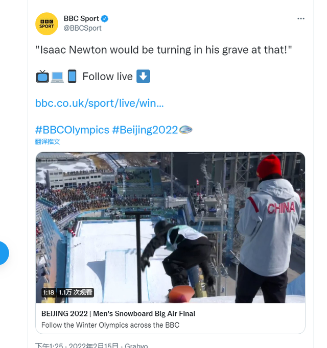 当天下午,BBC体育在社交媒体上发布了苏翊鸣比赛的视频片段,并配了一段话:“艾萨克·牛顿的棺材板都压不住了(Isaac Newton would be turning in his grave at that)!"