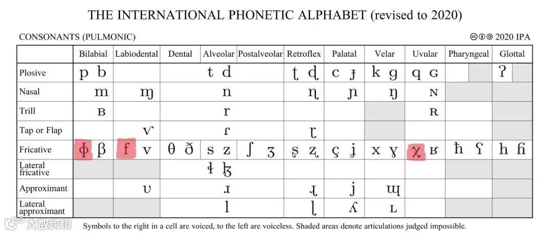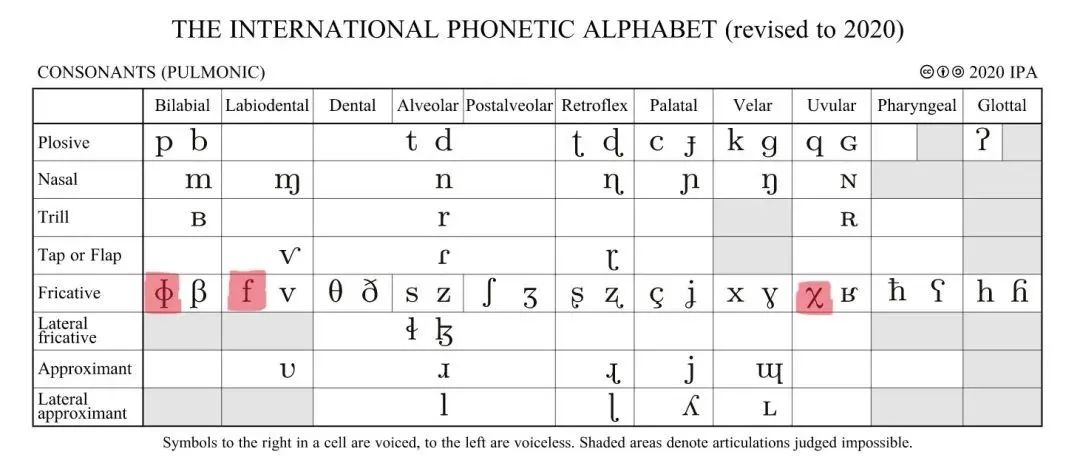 (国际音标辅音表:图中标红从左到右分别是第三种、第一种和第二种情况的目标音)