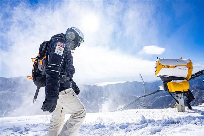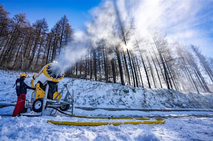 There are totally nine types of snow made by snow machines, with different water content. The smaller type number is closer to powder snow. The larger number means the snow is wetter. Drier snow is used in the daytime, while No. 7 or No. 8 snow is used during the nighttime with over minus 20 degrees Celsius.