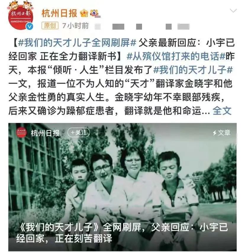 文章题为《杭州男子从殡仪馆打来电话:能不能写写我们的天才儿子》,这是一个伴随着巨大苦难与奇迹的真实故事,讲述了一位不为人知的“天才”翻译家金晓宇和他父亲金性勇的真实人生。