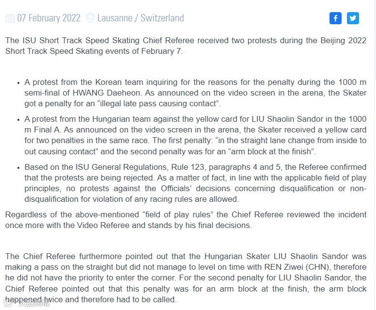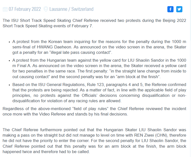 The ISU Short Track Speed Skating Chief Referee received two protests during the Beijing 2022 Short Track Speed Skating events of Feb 7.
