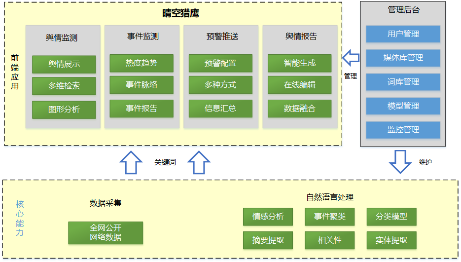 京东数科晴空猎鹰舆情监测平台是通过京东数科智能网络机器人技术、自然语言处理技术、自动分类聚类技术、云计算等关键核心技术,对海量的网络信息进行深度挖掘和智能分析,实现对网络舆情信息的实时监测、热点追踪、分析研判、自动预警。为企业收集品牌口碑、快速应对负面事件、实时掌握竞争对手动态,做出正确决策提供分析依据。