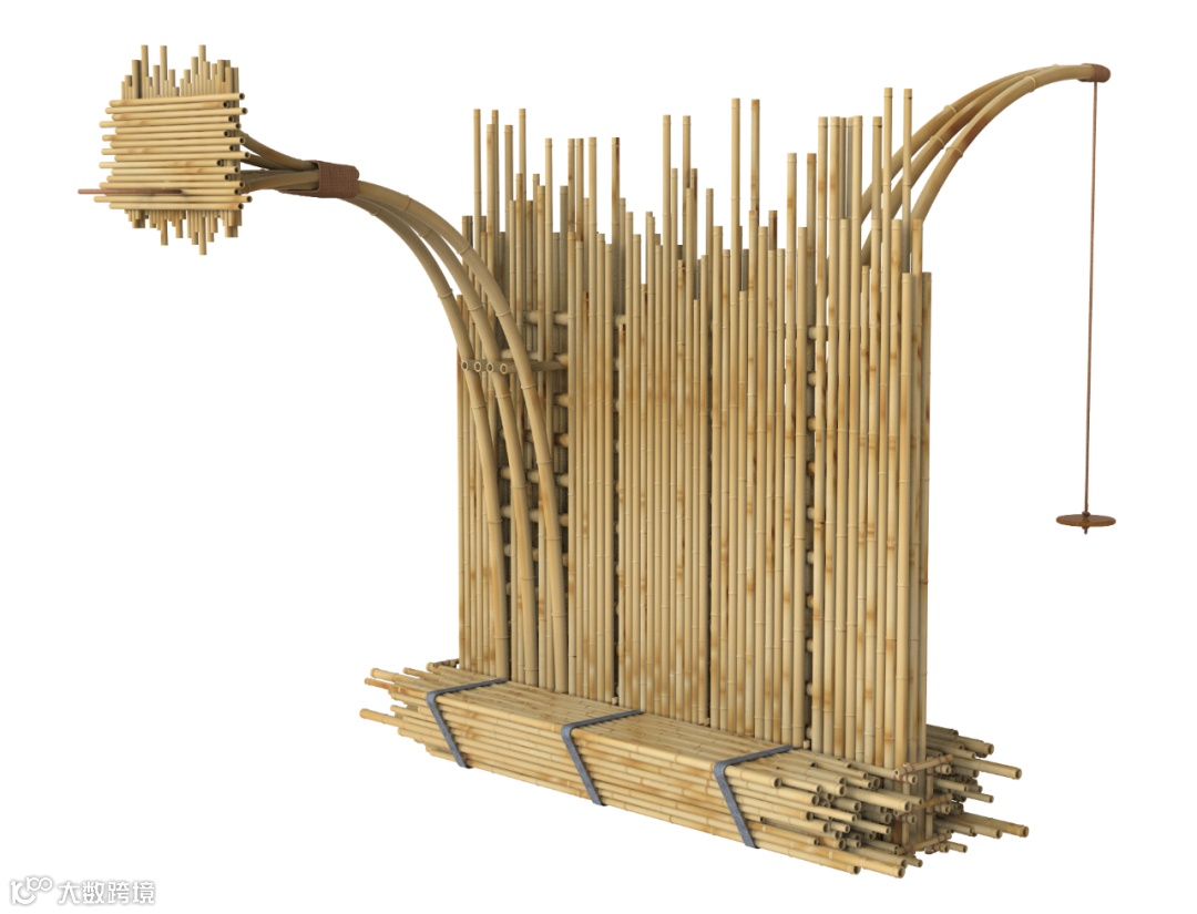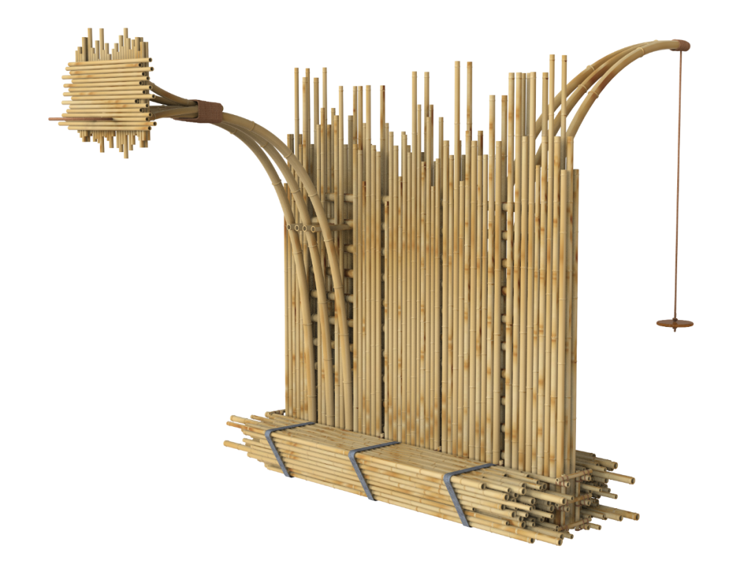 竹林,在五感上总给人带来可细细品尝的感知,其综合是一种生命律动,又因宁静使人的直觉变得特别的敏锐。风穿过竹叶的沙沙声和竹秆相互碰撞的清脆声响,阳光透过竹叶与枝条所撒下的光影,空气中特有的清香皆使人忘我,惬意舒适而有诗意。这件设计,横向堆积参差不齐的竹管,提供了小坐休憩的平面空间,而立面是竖向排列参差不齐的竹秆,试图营造出竹林的氛围,同时将空间一分为二,“弹椅”和“球筐”各置一边。