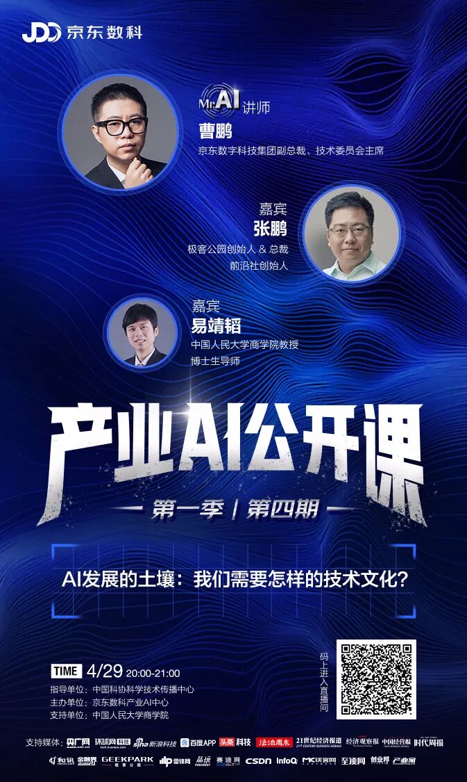 明晚8点,由中国科协科学技术传播中心担任指导单位、京东数科产业AI中心主办、中国人民大学商学院支持的“产业AI公开课”第一季第四期重磅开播!本次主题是【AI发展的土壤:我们需要怎样的技术文化?】,聚焦AI等核心技术发展的文化机制,极客公园创始人兼总裁张鹏、人大商学院教授易靖韬、京东数科副总裁曹鹏将跨界展开深度对话!