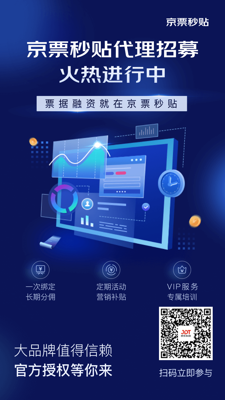 现在,我们正式开启第二季京票秒贴全国代理商招募,希望能与更多有票据客户资源的代理商伙伴,共享资源,开拓市场,并提供长期交易分佣、整合营销支持、专业客服团队等优惠政策。