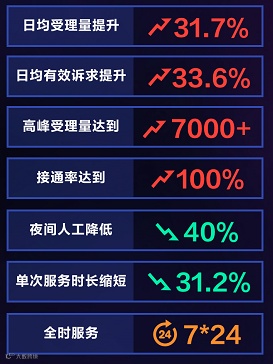 据大同12345市民服务热线负责人介绍,在智能化升级之前,受人工坐席数量限制,最高日受理只能达到4000件,而目前日均呼入总量已达到5269通,较原系统增加31.7%,高峰呼入总量超7000通,溢出部分全部由智能客服接待,呼入电话接通率已达100%。