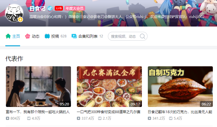 姜轩的团队是2018年百大UP主之一。截至11月初,《日食记》在哔哩哔哩上的官方账号已上传459集视频,目前拥有629万粉丝。