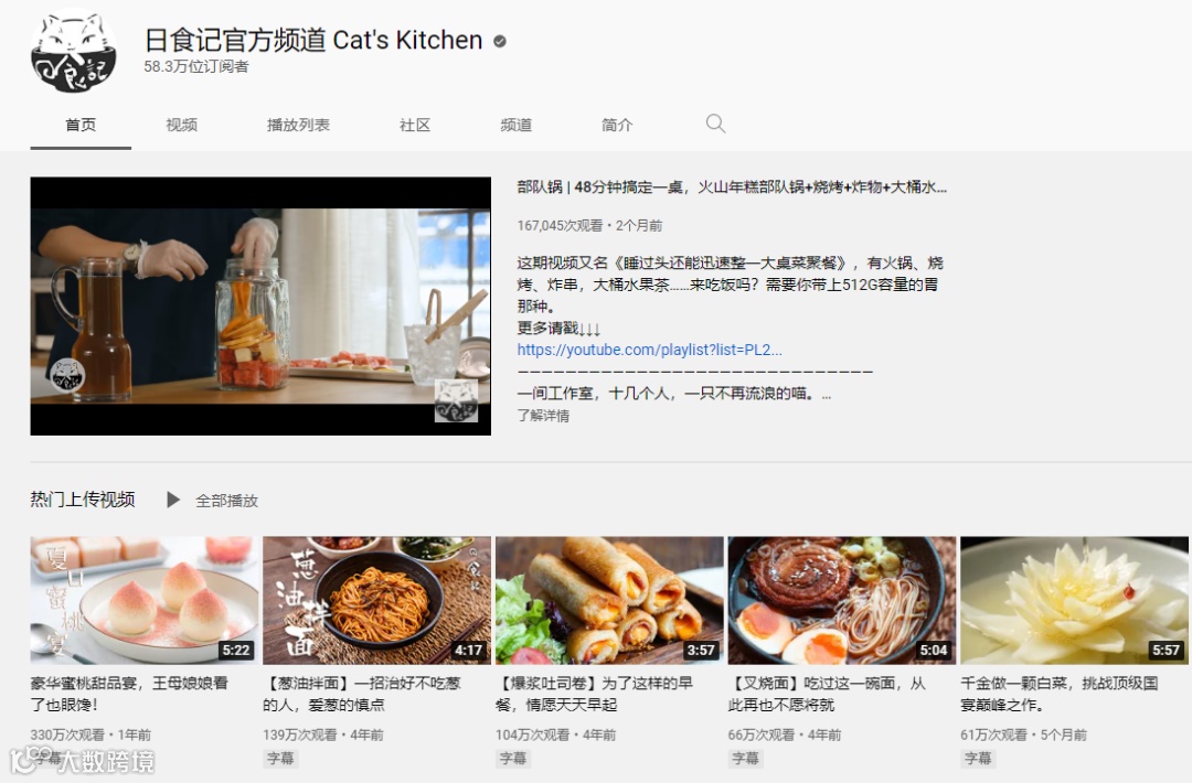 The major video-sharing platform was Tudou, where Jiang launched the first episode of Cat's Kitchen, a series of food video clips specializing in Chinese cuisine and traditional delicacies, which had more than 54 million subscribers across all platforms by the end of last year.