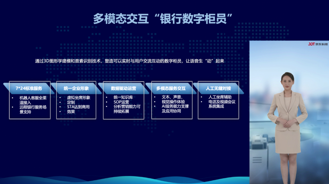 基于多模态智能人机交互技术,京东智能客服言犀打造了“数字柜员”矩阵,可以实现自主应答、主动服务、质检与合规、智能工作台、员工培训、客户洞察等全流程服务。其中,多模态数字人是智能人机交互技术的一个崭新的应用方向,京东智能客服的数字柜员通过合成语音、情绪、视觉形象和三维的图形建模,可以对语音个性化进行定制,定制形象风格、通过语音和情绪驱动面部动作和表情,塑造可以实时与用户交流互动的数字柜员,让语音生“动”起来。