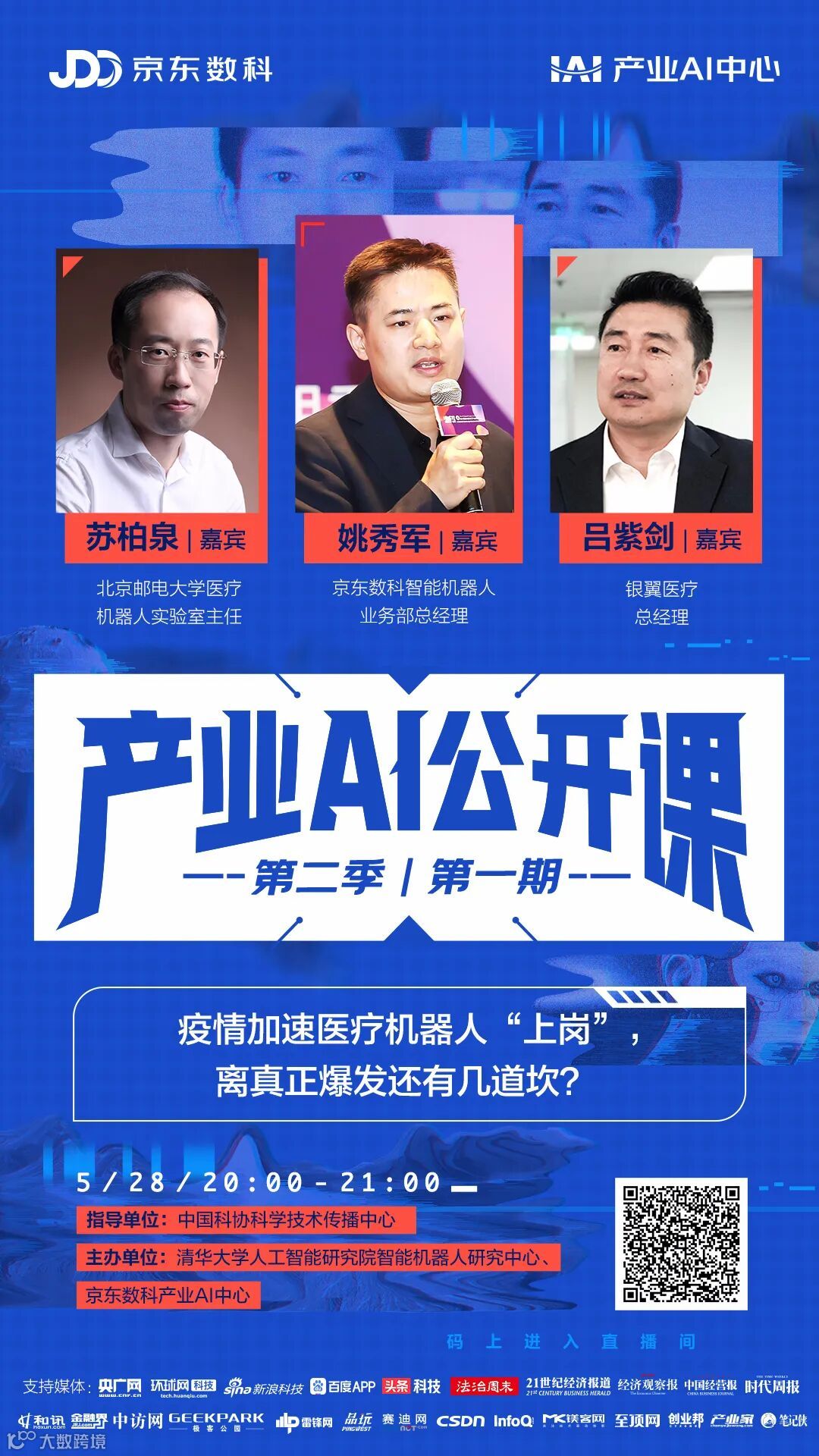 明晚8点,京东数科将产业AI中心第二季正式开播!北京邮电大学医疗机器人实验室主任苏柏泉、银翼医疗总经理吕紫剑、京东数科智能机器人业务部总经理姚秀军,产学研三方大咖将围绕【疫情加速医疗机器人“上岗”,离真正爆发还有几道坎?】,带你走进机器人与医疗结合的未来世界,以冀为你带来启发,并为你的想象注满能量。