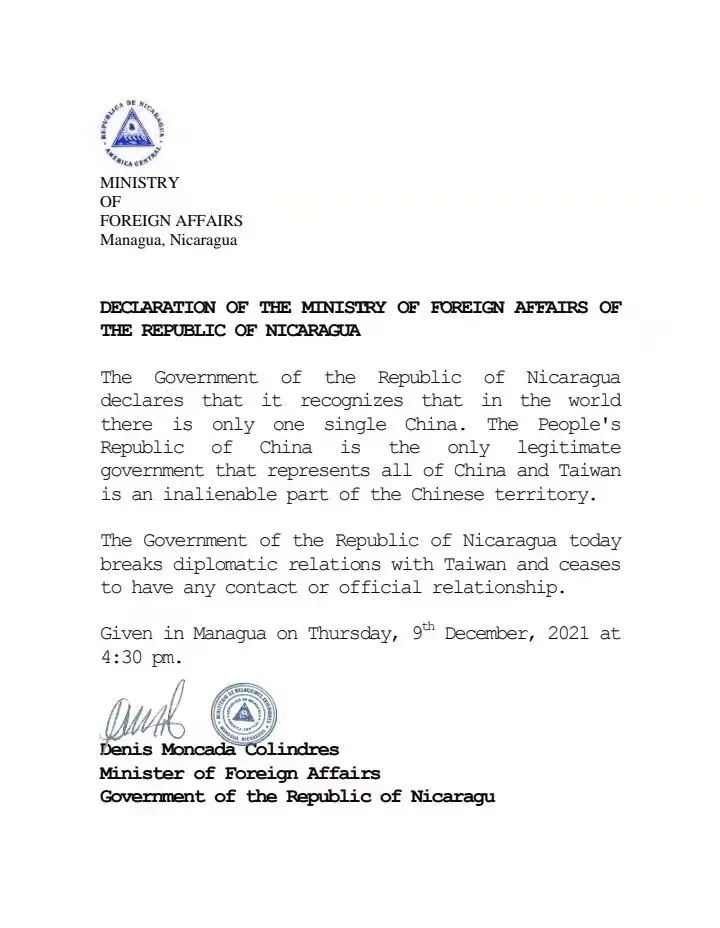 尼加拉瓜外交部当地时间9日下午发表声明,宣布与台湾断绝“外交关系”。
