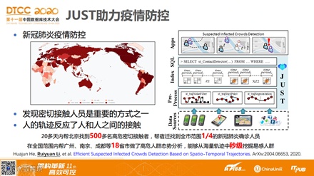 右边是我们的系统框架,我们的系统部署在了多个部门,实时接入了多种时空数据,使用我们预置的多种时空处理算法,构建了有效的时空索引,以高效支持关联人查询分析。在疫情最严重的前20天,我们的系统帮助北京市找到了500多名高危密切接触者,帮助宿迁市找到了全市范围内四分之一的新冠肺炎确诊人员,在全国范围内帮助广州、南京、成都等18个省市做了高危人群态势分析,能够从海量的轨迹数据中秒级挖掘出易感人群。相关的论文已经发表在了ArXiv上,大家感兴趣的话可以下载阅读。