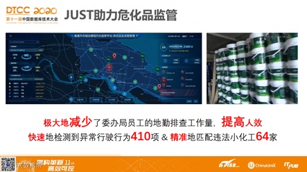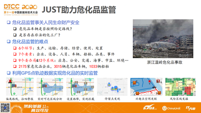 大家可能还记得,在今年的6月13日,浙江温岭发生了一场严重的危化品爆炸事故,造成了20多人的死亡,170多人的受伤。因此,危化品的监管事关人民的生命财产安全,受到了政府部门的极大关注。我们JUST目前在危化品监管上主要做了两件事情:1)危化品车辆是否按照了报备的路线行驶?因为如果危化品车辆驶入了居民区,会造成严重的安全威胁;2)是否存在非法的化工厂?比如,有些居民可能会将自己的民房腾出来,用来存储一些化工用品,我们称之为“黑化工”,另外,一些不符合要求的化工厂,被政府勒令关停后,还可能偷偷进行生产。对危化品的监管是非常困难的,以南通为例,危化品监管涉及到6个环节,7个要素,需要9个不同的政府部门协同,12个软件系统的联动,而南通共有2000多家危化品企业,3000多辆危化品车辆,1000多艘船舶,一线的危化品监管人员只有20多人,如果只是通过人工进行排查,是非常困难的。我们JUST部署到了南通,很好地解决了上述两个问题。我们的系统实时接入了危化品车辆的轨迹数据。