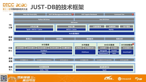 这是我们JUST-DB的技术框架图,由图可知,我们还用到了很多其他的分布式组件,并且把它们有机地整合在了一起(注:标记有问号的模块是规划中的模块)。采用了分布式组件,能够让JUST支持海量的时空数据,扩展性很强。