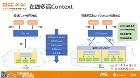 使用两个SparkContext是为了保证系统的高可用,当其中一个SparkContext崩溃时,另一个SparkContext能够及时地响应用户的请求。总之,我们在线多活的SparkContext方式,能够减少资源的申请时间,进一步加快查询效率,同时还能够提高系统的稳定性。