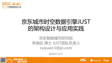受疫情影响,第十一届中国数据库技术大会(DTCC2020)从原定的5月份,推迟到了8月份,再推迟到了12月份。尽管如此,依然没有减退国人对数据库技术的热情。2020年12月21日-12月23日,北京国际会议中心人头攒动,各大厂商争奇斗艳。在NoSQL技术专场,京东智能城市研究院的李瑞远博士给大家带来了《京东城市时空数据引擎JUST的架构设计与应用实践》的主题报告,受到了大家的广泛关注。(在京东数科公众号回复“DTCC2020”,即可下载完整PPT)