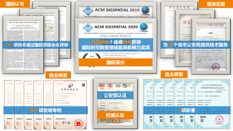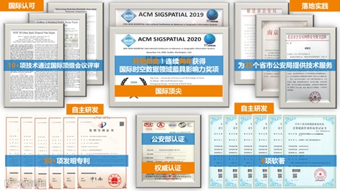 我们一直要求自己做“顶天立地”的事情,除了真真切切地解决实际问题,还积极沉淀理论知识。过去不到3年的时间,我们JUST有十余项技术通过了国际顶级会议或者期刊的评审,我们JUST也开创了历史,是世界上首次连续两年获得国际时空数据领域十年影响力大奖的团队。到目前为止,我们为25个省市公安局提供了技术服务,并收到了他们的感谢信。基于JUST,我们提交了30余项发明专利,并获得了公安部的权威认证。截止到目前,我们通过了6项软著。