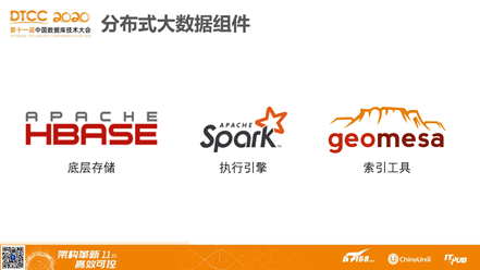 另一方面,JUST原生使用了多种分布式框架,这里列出了几个重要的框架,例如:我们采用HBase作为底层的存储引擎,Spark作为执行引擎,GeoMesa作为索引工具。