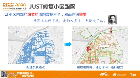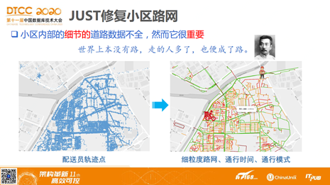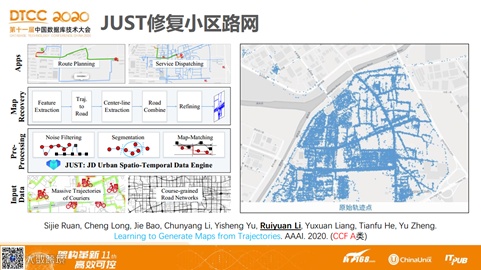 这是我们系统的基本框架。JUST平台接入海量快递员的轨迹信息以及粗粒度的路网信息,然后对轨迹信息进行去噪、分段和地图匹配,提供高效的时空查询给上层模型。我们训练了一些深度学习模型,能够很好地修复小区内的路网。相关工作也被国际顶级人工智能会议AAAI成功接收,大家感兴趣的话可以去看一下。