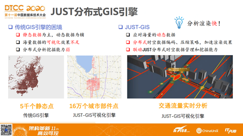为此,我们提供了一个JUST-GIS模块,主要面向的是动态为主、静态为辅的时空数据,借助于底层的JUST-DB模块,能够实时快速地接入海量的时空数据;借助于JUST-DM模块,我们能够与一些分析算法进行联动。我们也实现了一些分布式时空数据的编码、压缩策略,能够加快渲染效果。中间的图展示的是使用我们JUST-GIS引擎,对16万个城市部件的展示效果,可以看到,我们的引擎能够丝滑地放大、缩小、拖动地图。右边的图是一个实际案例,我们实时接入了城市中的车辆GPS轨迹数据,对轨迹数据进行地图匹配操作,分析出每条道路的速度和车流量信息。同时,我们也对GPS点实时聚类,减少前端的渲染压力。