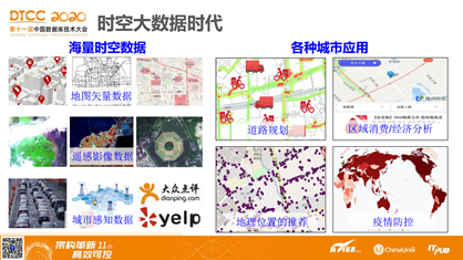 随着5G、IoT技术的发展,产生了海量的时空数据。时空数据简而言之,就是具有时间属性和空间属性的数据。这些时空数据大体可分成三类。第一类是我们打开手机地图看得到的地图矢量数据;第二类是卫星遥感影像的数据;第三类就是城市的感知数据,包括车上的GPS数据、手机跟基站进行交互的信令数据、以及我们在社交媒体上的签到数据。大家进入咱们的会议中心时,使用北京健康宝扫描了二维码,其实也是一种签到数据。这些时空数据能够应用到很多城市应用中。由于时间关系,我只举一个例子。在疫情防控中,如果某地发现了新冠确诊病例,我们就可以通过北京健康宝的签到数据,找到所有在这段时间范围内到过该地的那些人,并重点对这些人进行排查,实行保护措施,防止疫情的扩散。