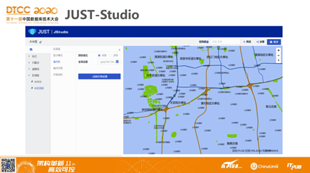 这是我们的JUST-Studio用户界面。它能够对地图上的所有要素进行可视化编辑,比如一条路显示的颜色、粗细。通过JUST-Studio,用户可以自定义自己的地图样式。未来,JUST-Studio将会成为所有JUST能力的可视化输出窗口,用户甚至不要写SQL语句了,通过它能够直接调用我们底层的能力,所见即所得地生成上层的解决方案。