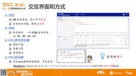 现在不同的开发人员使用的开发语言可能不一样,例如,做后端服务开发的同事可能使用Java进行开发,做数据分析的同事可能使用Python进行开发,但所有这些同事的普通话,就是SQL。JUST提供了SQL的交互方式,能够减少大家的学习成本。此外,SQL为我们定义好了统一的输入输出格式,这样也方便开发人员自由组合我们的功能,例如是先对轨迹进行过滤,再对轨迹进行分段,还是先对轨迹进行分段,再对轨迹进行过滤,都可以由开发人员自由指定,这提高了咱们系统的灵活性。我们的目标就是,我们所有的操作,包括数据查询、数据定义、数据处理、数据分析,都可以用一句简单的SQL语句进行实现。我们自己实现了一套完整的SQL优化器,能够实现过滤、投影等谓词下推、常量的计算,还能对查询进行重写。为了让开发人员能够像使用MySQL数据那样使用我们的JUST,我们还实现了一个符合JDBC标准的DB Driver。这极大地提高了我们系统的易用性。我们系统的论文,也被今年数据库顶级会议ICDE 2020成功接收。