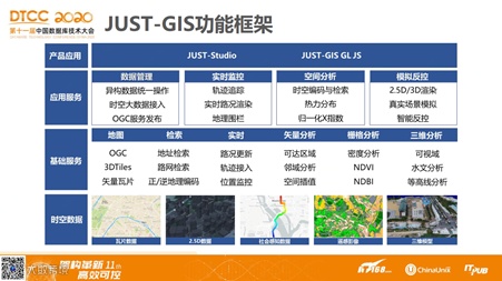 这是我们的JUST-GIS的基本功能框架,中间基础服务和应用服务是JUST-GIS-Server,封装了各种GIS分析功能,能够发布GIS服务;JUST-Studio和JUST-GIS GL JS是前端展示模块和SDK包。