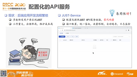 我们发现,目前为外部提供JUST服务时,后端开发人员大多数只是转发前端的请求到JUST-DB中,但是需要他们单独部署一个后端服务,同时还要考虑鉴权、限流、缓存、日志等功能,造成后端开发工程师工作量极大,而且容易出错,维护成本很高。为了减少后端的开发工作量,我们JUST-Service模块,提供了配置化的API服务,用户只需要在系统中配置一些参数,即可对外提供API服务接口,真正实现了零代码量。