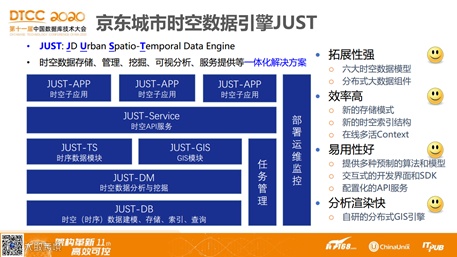 为了解决上述问题,我们提出了京东城市时空数据引擎JUST,JUST正是英文名字JD Urban Spatio-Temporal Data Engine各单词的首字母缩写。JUST提供了一个集时空数据存储、管理、挖掘、可是分析、服务提供等一体化解决方案。