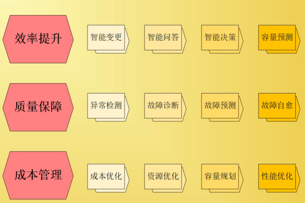 AIOps围绕质量保障、成本管理和效率提升的基本运维场景,逐步构建智能化运维场景。在质量保障方面,细分为异常检测、故障诊断、故障预测和故障自愈等基本场景;在成本管理方面,细分为指标监控、异常检测、资源优化、容量规划和性能优化等基本场景;在效率提升方面,分为智能预测、智能变更、智能问答和智能决策等基本场景。