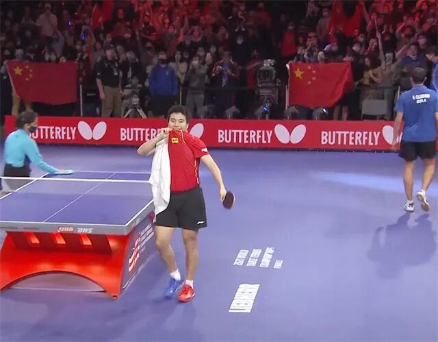 获胜的瞬间,梁靖崑激动地蹦跳起来,向看台上的中国球迷们挥手示意,把球拍放在耳朵边聆听球迷们的欢呼尖叫声,随后更深情亲吻球衣上的国旗标志。
