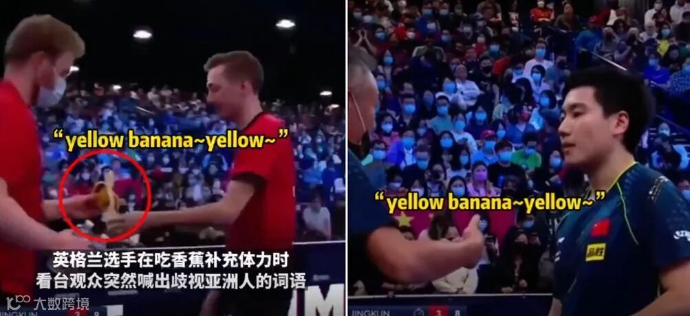 11月27日,2021年世乒赛男子单打展开第四轮角逐,中国队选手梁靖崑与英格兰选手皮切福德进行交锋。当争夺决胜局比分到8:4时,刚刚赢下一球的皮切福德向裁判示意要求休息,吃起了别人递过来的一根香蕉补充体力。此时,看台上出现了不和谐的声音——有人冲梁靖崑大喊“yellow banana”(黄香蕉)。