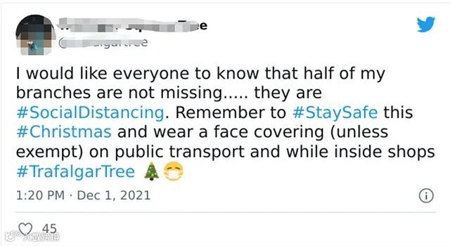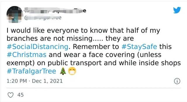 “我想告诉大家,一半的树枝不是不见了……它们是在保持社交距离。记得今年圣诞节要做好防护,(除例外情况)要在公共交通和商店内部戴好口罩哦。”