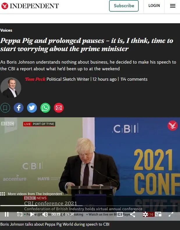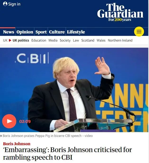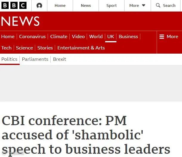 其网页版报道中也提及,约翰逊这次糟糕的演讲很“尬”,遭到了商界领袖和党内议员的批评。