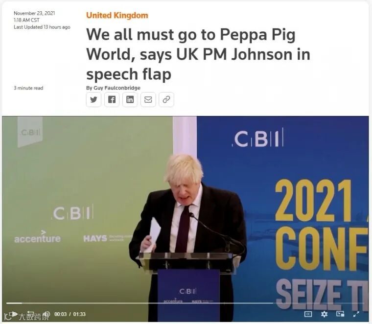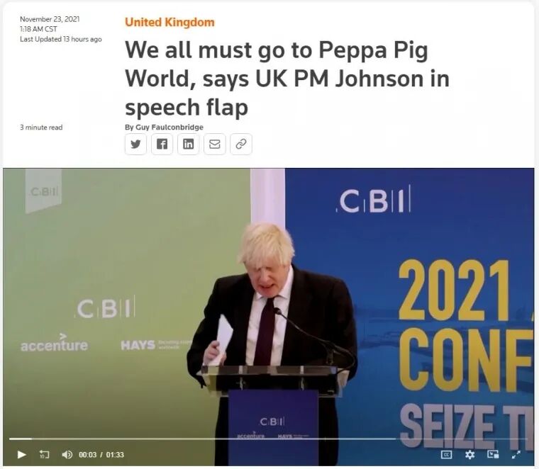 路透社:英首相约翰逊在演讲慌乱中说道:我们都一定要去“小猪佩奇世界”