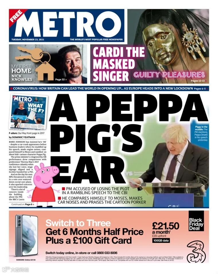 《地铁报》则用Pig's ear(搞砸了)和约翰逊找稿子的动作相结合,态度不言自明。