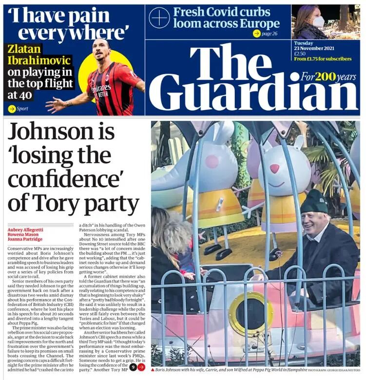 《卫报》的报纸上,约翰逊在“小猪佩奇世界”游玩的画面登上头版,标题则写道他“正失去保守党的信心”。报道中引用了一些保守党议员的话,质疑约翰逊是否有能力领导该党。